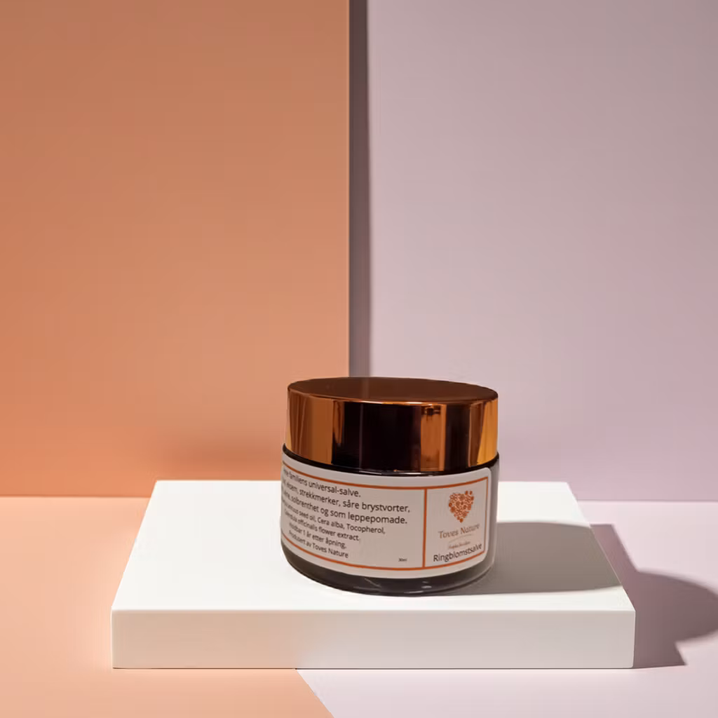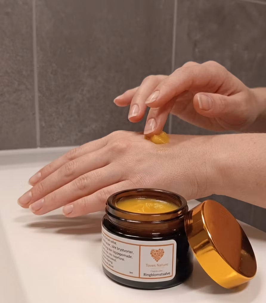 Ringblomstsalve, også kjent som calendula salve, er en tradisjonell urtesalve laget av ringblomst (Calendula officinalis). Den er kjent for sine beroligende, mykgjørende og reparerende egenskaper, og brukes ofte på sensitiv hud, babyhud og irritasjoner. Vår salve er økologisk, vannfri og helt uten eteriske oljer, noe som gjør den trygg selv for nyfødte og personer med svært sensitiv hud.